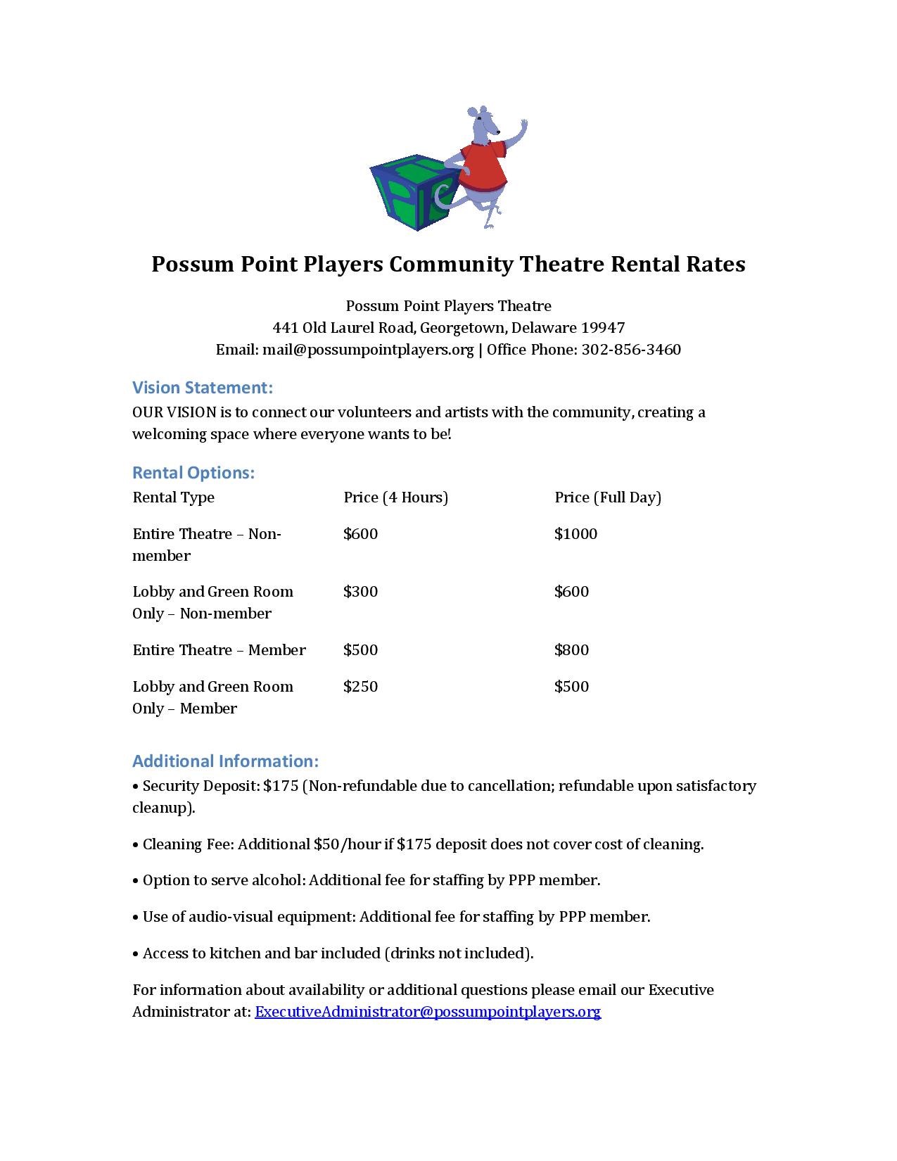 More information about the duties of these positions is available on the PPP website (www.possumpointplayers.org), and notices about the time of the annual meeting will be advertised in local media as well as through mass email and the PPP website.